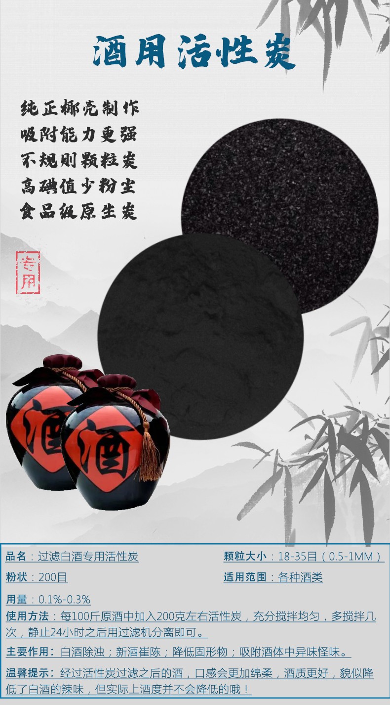 酒用活性炭在酒類(lèi)中的應(yīng)用很廣,幾乎所有酒業(yè)都離不開(kāi)活性炭?;钚蕴繌V泛用于酒類(lèi)生產(chǎn)的后期處理,對(duì)去除酒中的沉淀物(低度白酒除濁,果酒、啤酒去除果膠、蛋白質(zhì)、酵母等),提高酒質(zhì),加速酒的陳化,去除酒中異味及苦味等都起到很好的效果。酒業(yè)專(zhuān)用活性炭廣泛用于白酒提純?nèi)ギ愇?、葡萄酒脫色除異味及啤酒提純?nèi)ギ愇丁?br />酒用專(zhuān)用椰殼活性炭用于處理工藝優(yōu)勢(shì):