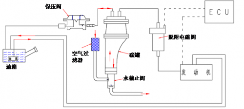 3.發(fā)動機怠速忽高忽低,車輛無法加速。這種情況可能是由于碳罐的空進氣口和濾網(wǎng)堵塞,外界空氣體不易進入碳罐,使氧傳感器混合氣過濃,減少了發(fā)動機的噴油,導(dǎo)致怠速升高,加速無力的現(xiàn)象。
