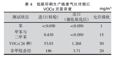 由于包裝印刷生產(chǎn)線VOCs 廢氣的質(zhì)量濃度偏低(<600 mg/m3),需采用沸石轉(zhuǎn)輪- 催化氧化裝置對(duì)廢氣進(jìn)行濃縮后再作加熱催化氧化處理。6條生產(chǎn)線入口風(fēng)量Q1=1 5 000 m3/h,每天生產(chǎn)16 h,工作日按330 d/a計(jì)算,那么每年排放的VOCs的總量約為:m 總=53.03 mg/m3×15 000 m3/h×5 280 h≈4.2 t/a。經(jīng)沸石轉(zhuǎn)輪- 催化氧化裝置處理前后的廢氣VOCs質(zhì)量濃度見(jiàn)表 4。