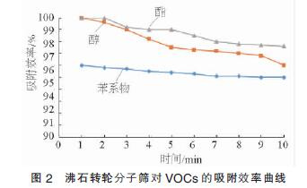 圖2表明,對(duì)于包裝印刷行業(yè)廢氣中含有的VOCs物質(zhì)(即苯系物、醇類與酯類物質(zhì)),疏水性分子篩均能進(jìn)行有效吸附。