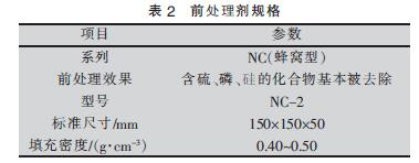 催化氧化分段裝置采用貴金屬Pt 作催化劑,對(duì)沸石轉(zhuǎn)輪處理后的高質(zhì)量濃度廢氣進(jìn)行預(yù)熱并將其催化氧化分解。其原理在于借助催化劑降低反應(yīng)活化能, 使得氧化反應(yīng)發(fā)生在較低的起燃溫度(250~400 ℃)。由于待處理廢氣中可能含有使催化劑中毒的物質(zhì)(含硫、磷、硅等元素的化合物),因此需在前端設(shè)置預(yù)處理工序, 即采用陶瓷為載體的前處理劑(見(jiàn)表2)對(duì)使催化劑中毒的物質(zhì)進(jìn)行攔截。當(dāng)進(jìn)入催化劑室的高質(zhì)量濃度廢氣溫度較低時(shí), 可通過(guò)燃燒器對(duì)其進(jìn)行預(yù)熱,使溫度上升至350 ℃;由于該溫度為氧化催化劑最佳活性溫度, 此時(shí)VOCs 的處理效率可達(dá)95%以上。