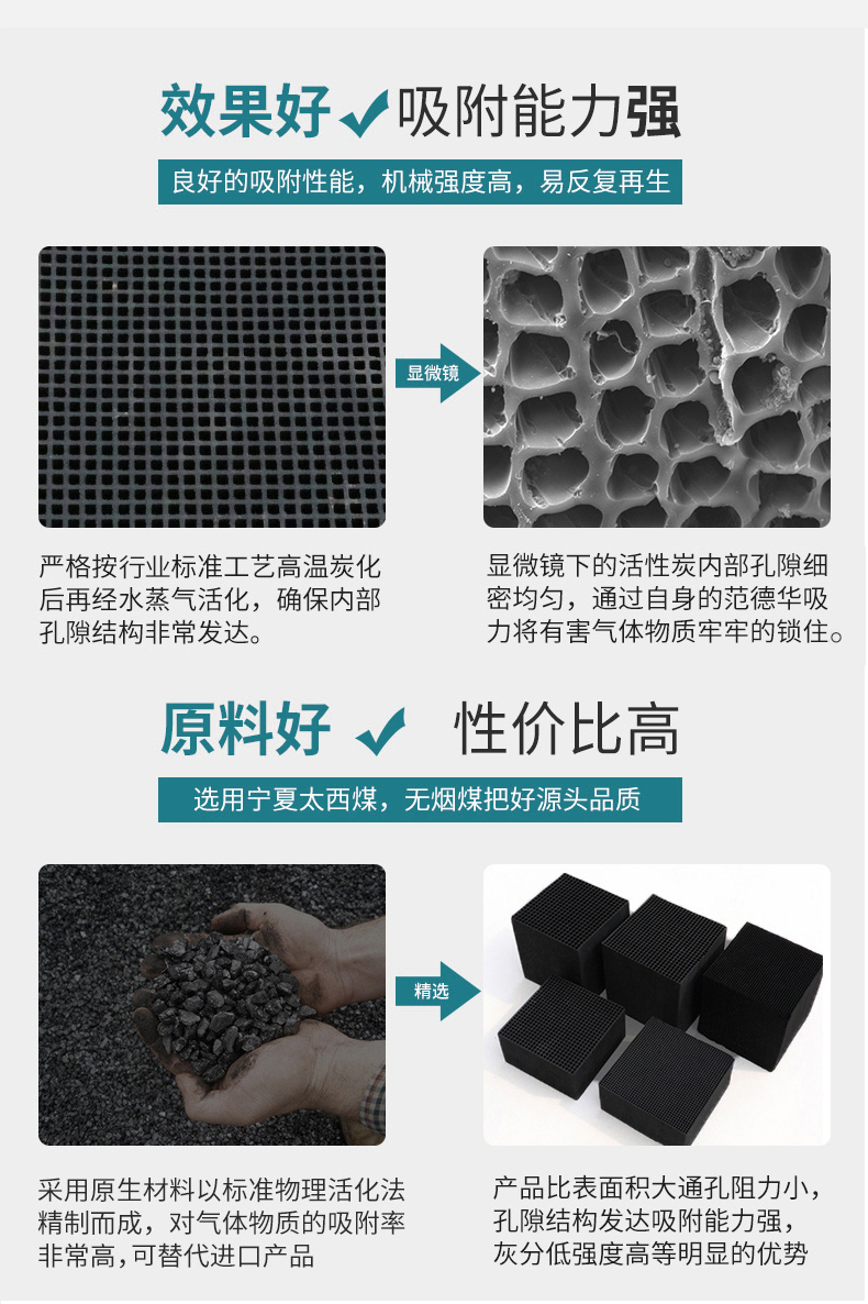 蜂窩狀活性炭吸附才能強,過濾面積大,催化燃燒設(shè)備一般都用蜂窩狀的,一般有正方體和長方體這些型號,可根據(jù)客戶的需要來現(xiàn)做蜂窩活性炭,這種廢氣處理活性炭的又是在于見效快,能長期運用??墒莾r格高于柱狀活性炭一倍還多。用蜂窩活性炭可不同程度去除的污染物有:氧化氮、四氯化碳、氯、苯、二甲醛、丙酮、乙醇、乙醚、甲醇、乙酸、乙酯、苯乙烯、光氣、惡臭氣體等酸堿性氣體;特殊蜂窩狀活性炭作用優(yōu)于普通活性炭,很多人都知道一個大概,但是具體對于特殊蜂窩狀活性炭的作用還是不清楚,下面介紹一下。